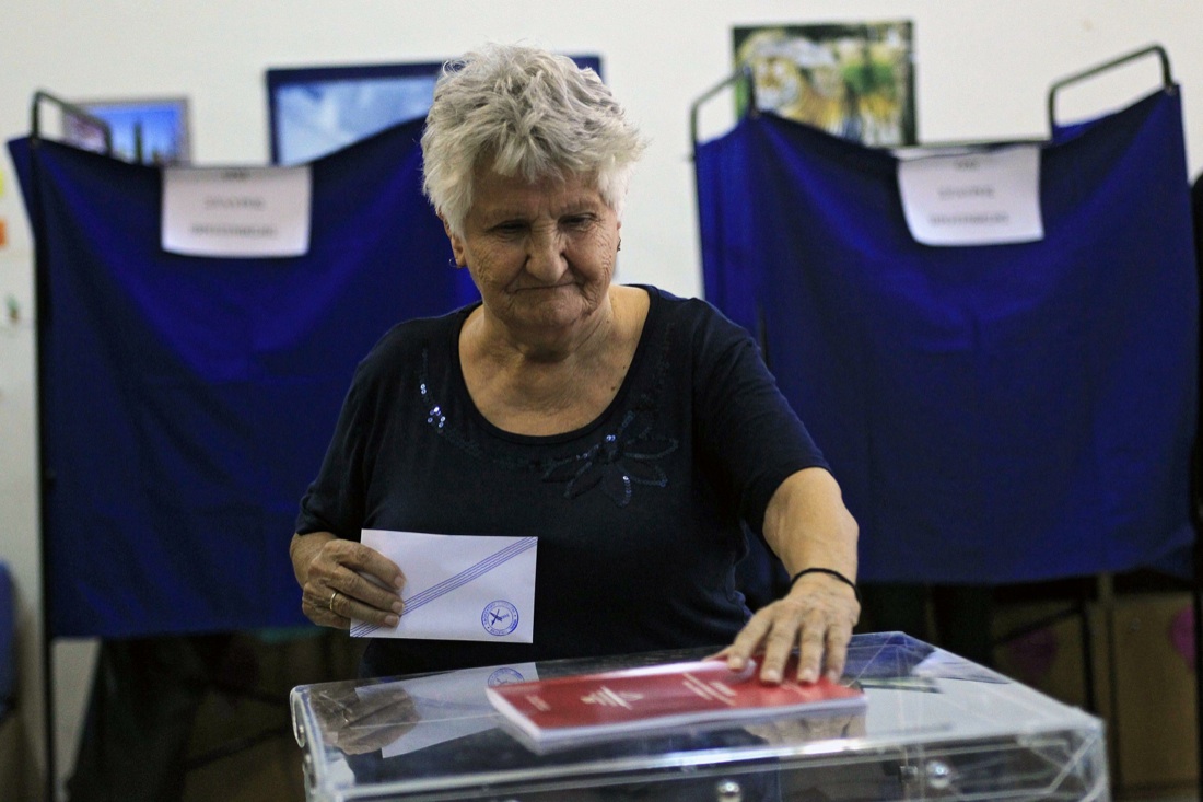 epa04939777 An elderly woman prepares to cast her vote at an election center in Athens, Greece, 20 September 2015. Greek voters take to the polls throughout Greece in general elections, after prime minister Tsipras resigned on 20 August 2015. EPA/YANNIS KOLESIDIS