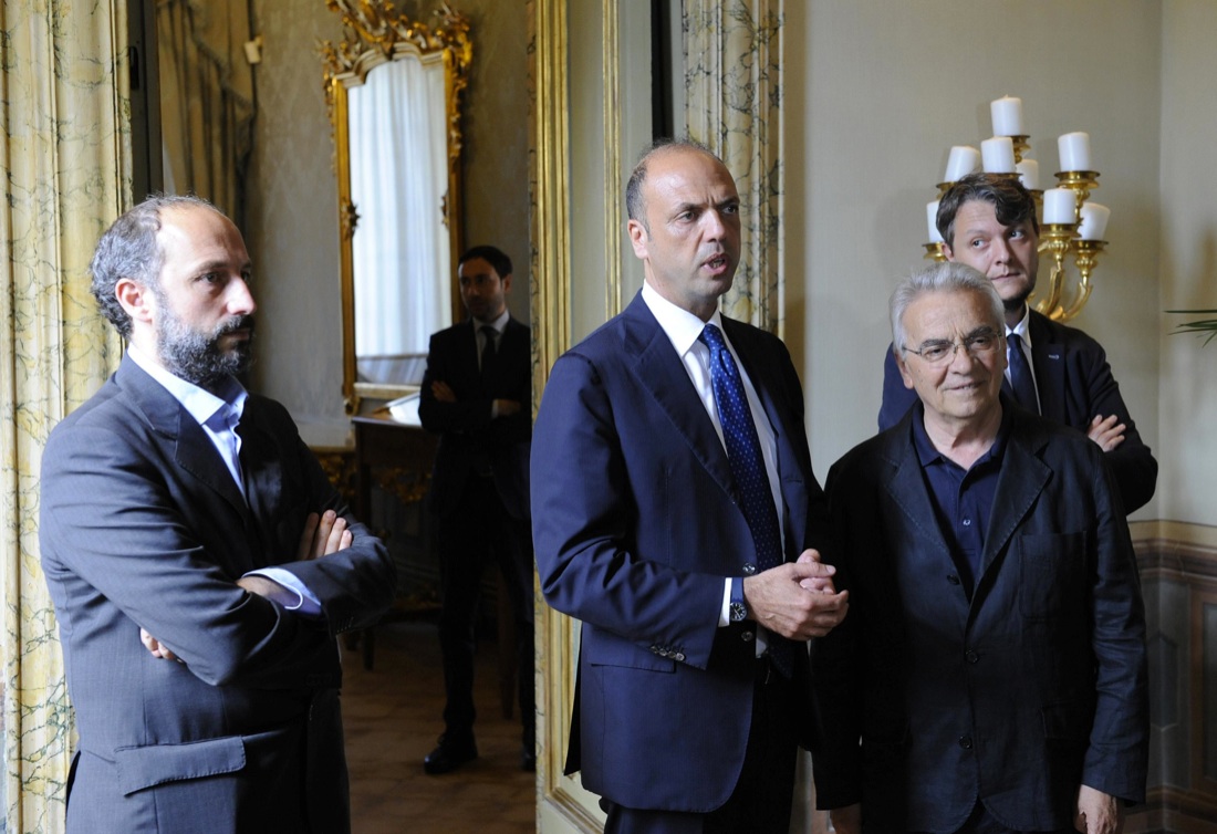 Il ministro dell’Interno Angelino Alfano con Don Vinicio Albanesi prima della riunione del Comitato per l’ordine e la sicurezza pubblica presso la Prefettura di Fermo dopo la morte del migrante nigeriano di 36 anni, pestato da un ultrà. Fermo 7 luglio 2016.