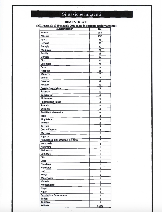 Dal 1 gennaio al 10 maggio 2021 in totale sono stati rimpatriati 1290 migranti. Questi i dati paese per paese.