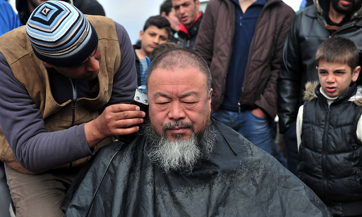 17 marzo 2016. Un migrante rade la testa dell’artista cinese Ai Weiwei tra le tende del campo di transito per migranti di Idomeni, sul confine tra Grecia e Macedonia, dove decine di migliaia di migranti e rifugiati attendono la non prevista riapertuta delle frontiera. I leader dell’Unione europea sono impegnate in un vertice con la Turchia per raggiungere un accordo che argini la crisi migratoria.