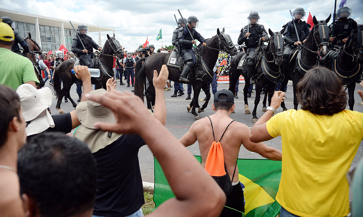 17 marzo 2016. Manifestanti affrontano la polizia a cavallo vicino al Palácio do Planalto, sede ufficiale della Presidenza della Repubblica del Brasile, durante una protesta contro la nomina a ministro dell’ex presidente Luiz Inacio Lula da Silva dopo la formalizzazione delle accuse di corruzione a suo carico.