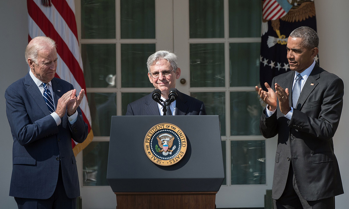16 marzo 2016. Il giudice Merrick Garland applaudito dal presidente Barack Obama e dal Vicepresidente Joe Biden, dopo l’annuncio della nomina di Garland, 63 anni, a membro della Corte Suprema, nel Rose Garden della Casa Bianca a Washington, DC, negli Stati Uniti.