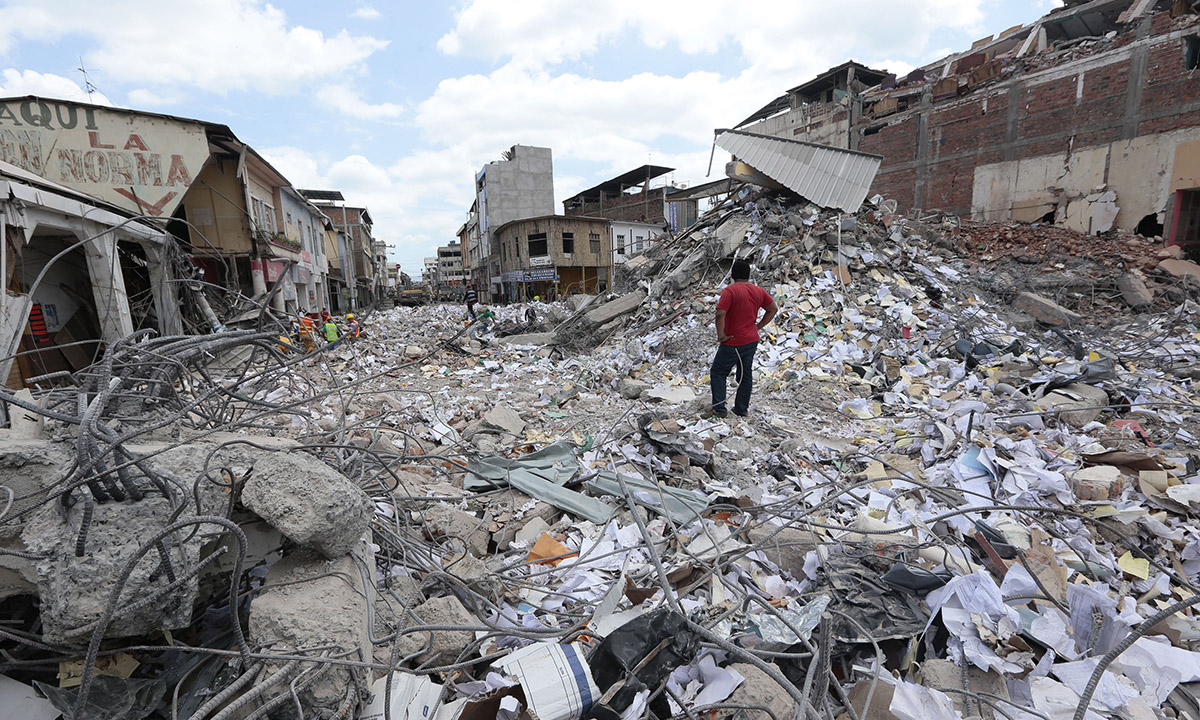 20 aprile 2016. Un uomo osserva le macerie lasciate dal terremoto a Portoviejo, in Ecuador, colpito da un sisma di magnitudo 7,8 (scala Richter) con epicentro a 27 chilometri dalla costa, nell’oceano Pacifico. Il bilancio delle vittime conta almeno 413 morti e 2.500 feriti. Il peggior terremoto degli ultimi 70 anni, secondo il presidente Rafael Correa.