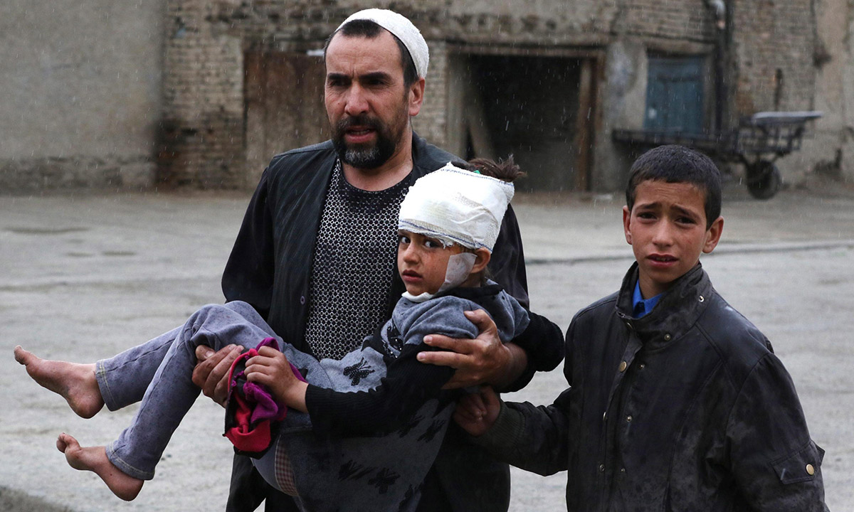 19 aprile 2016. Un uomo porta in braccio una bambina ferita da un attacco suicida contro il Ministero della Difesa a Kabul, in Afghanistan, ad opera di militanti talebani.