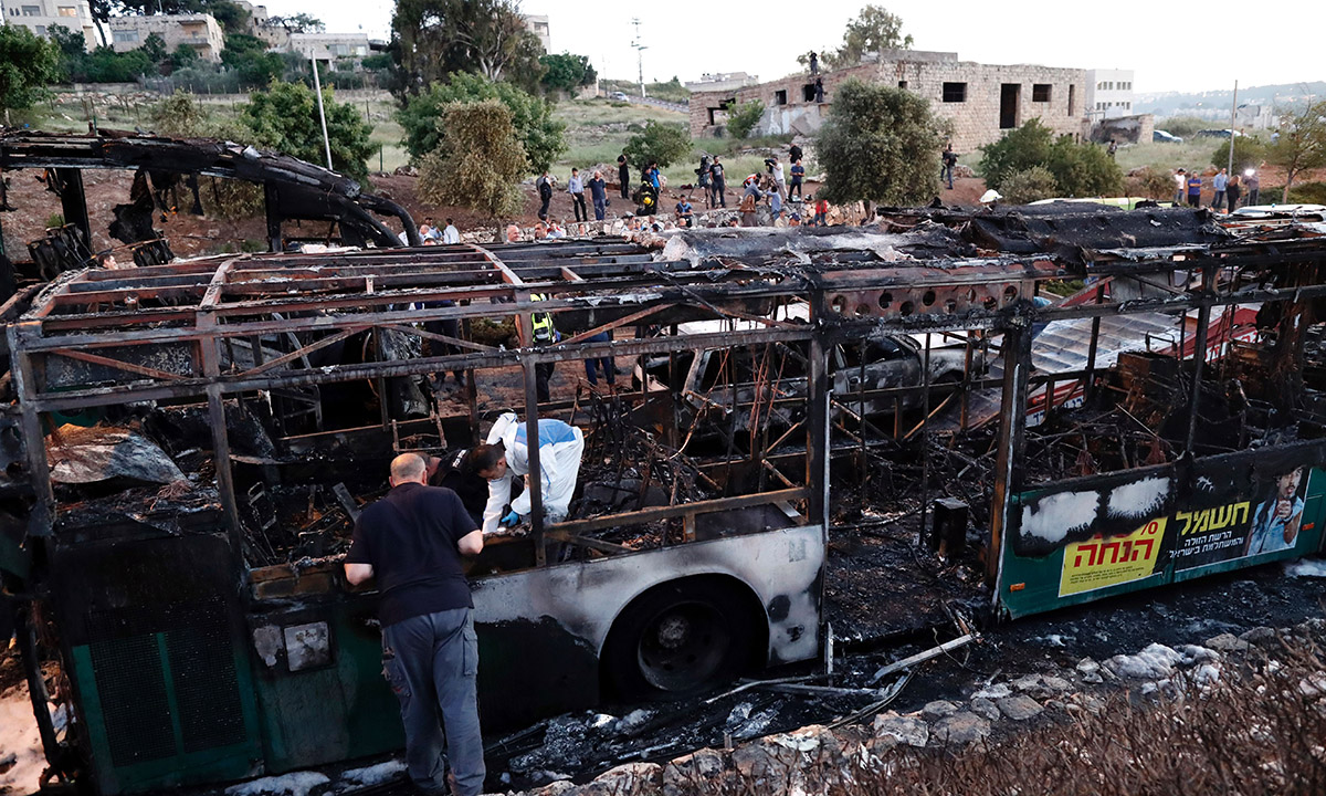 La polizia forense israeliana esamina la carcassa di un autobus di linea, distrutto dall’esplosione di una bomba a Gerusalemme, in Israele. 20 passeggeri israeliani sono rimasti feriti. Hamas ha rivendicato l’attentato con un comunicato, in cui ha annunciato la morte di uno dei feriti, un uomo di Betlemme, ritenuto dalla polizia il possibile attentatore.