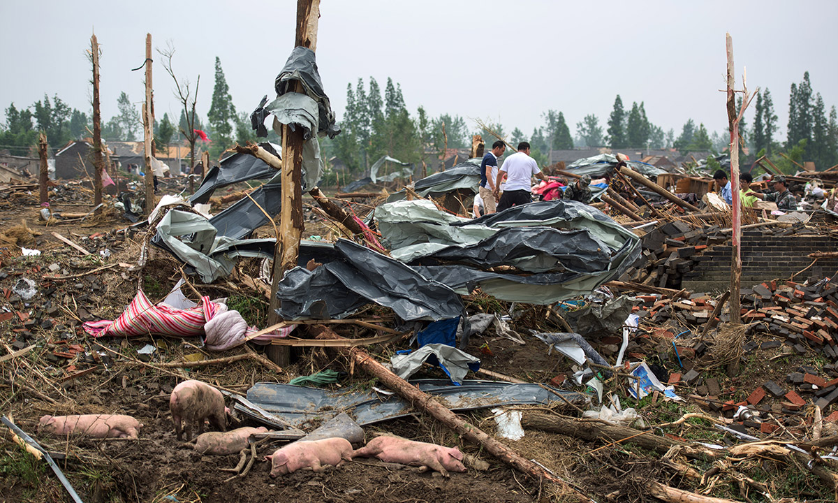 24 giugno 2016. La popolazione locale tra le macerie lasciate dal passaggio di un tornado a Yancheng, presso Funing, nella provincia dello Jiangsu, in Cina. Il più forte tornado degli ultimi 50 anni nel Paese, ha ucciso almeno 98 persone. Centinaia i feriti e 800 rimasti senza casa.