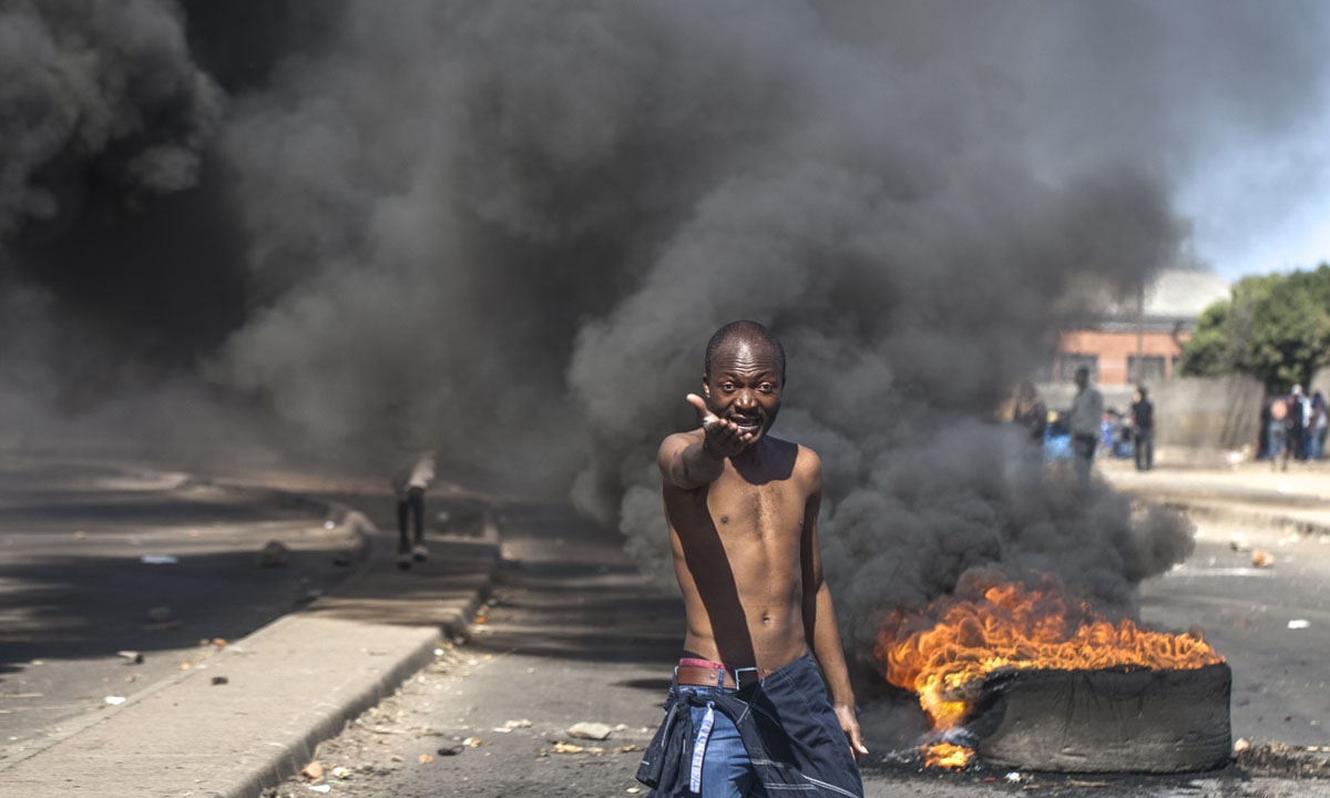 Un manifestante anti- Mugabe urla degli slogan di protesta accanto a degli pneumatici dati alle fiamme a Makokoba, Bulawayo, Zimbabwe. La popolazione si è scontrate con la polizia dopo l’arresto di due attivisti che manifestavano nel centro della città contro il presidente Robert Mugabe, accusato di non saper fare fronte alla grave crisi economica del Paese, di nuovo sull’orlo dell’iperinflazione. Allo sciopero generale hanno aderito la maggior parte dei lavoratori di negozi, banche, scuole e imprese.