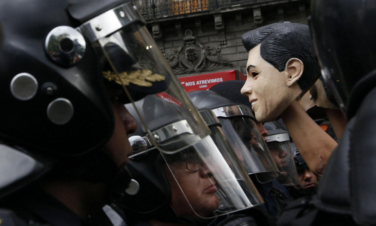Un esponente del Coordinamento nazionale dei lavoratori dell’istruzione del Messico (CNTE) impugna una maschera raffigurante il presidente Enrique Peña Nieto, circondaro da poliziotti, durante una protesta contro la riforma dell’educazione, a Città del Messico. Da mesi gli insegnanti messicani protestano contro la legge che prevede di assegnare un premio in denaro ai docenti giudicati “migliori”.
