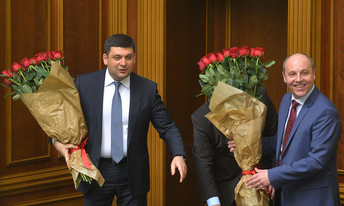 Il neo Primo ministro ucraino filo-occidentale Volodymyr Groysman (a sinistra) e il nuovo presidente del Parlamento, Andrij Parubij, con grossi mazzi di rose rosse fra le braccia nel corso di una sessione parlamentare a Kiev, in Ucraina.