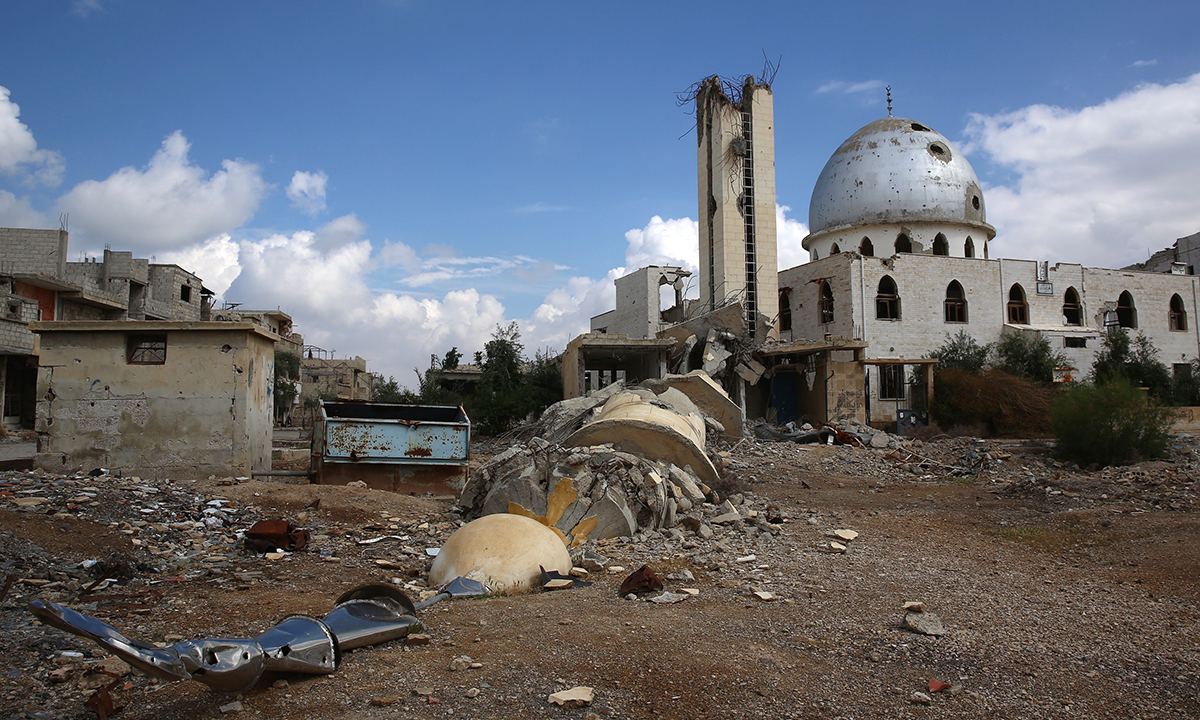 13 aprile 2016. Il minareto della moschea di al-Iman distrutto dagli attacchi aerei delle forze del regime sulla città di al-Nashabiyah, nella regione orientale di Ghouta, una roccaforte dei ribelli a est della capitale Damasco.