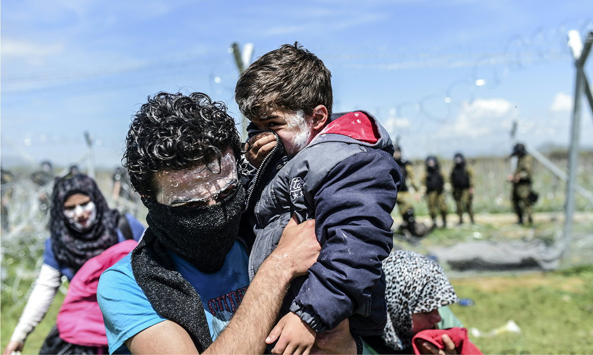 10 aprile 2016. I membri di una famiglia del dentifricio spalmato sui volti, a protezione contro i gas lacrimogeni, si mette in salvo dagli scontri in atto tra migranti e polizia macedone, durante una manifestazione dei rifugiati per chiedere la riapertura del confine greco-macedone, vicino al campo migranti improvvisato nel villaggio settentrionale di Idomeni.