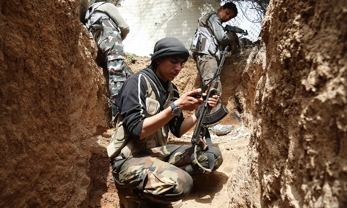 Combattenti dello Jaish al-Islam (Esercito islamico), il gruppo ribelle più importante nella provincia di Damasco, fieramente opposto sia al regime siriano e sia al gruppo “Stato islamico”, difendono una posizione nella città in mani ai ribelli di Douma, ai margini orientali della capitale.
