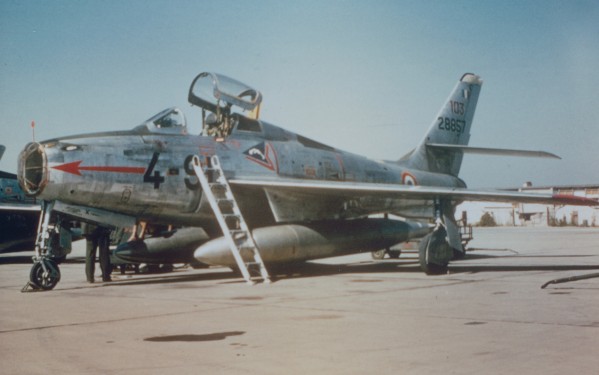 Caccia F84 dell’Arméè de l’Air come quello che il 29 agosto 1961 tranciò la fune portante della funivia dei Ghiacciai (6 morti)
