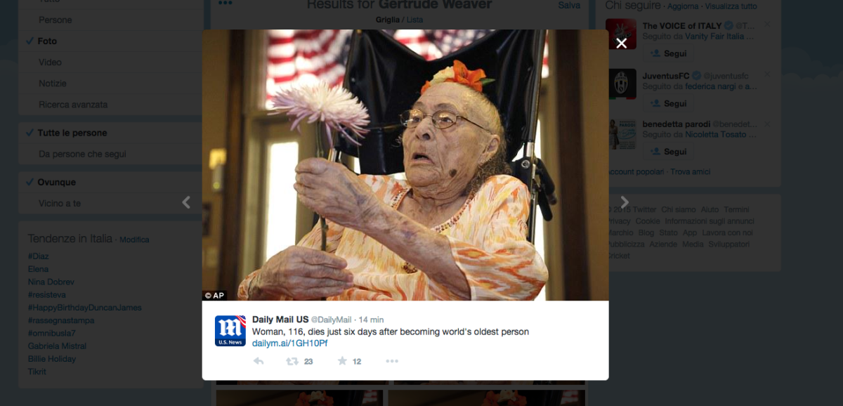 Gertrude Weaver avrebbe compiuto 117 anni il prossimo 4 luglio e avrebbe voluto come ospite della sua festa il presidente Obama. La nonnina a stelle e strisce aveva ereditato lo scettro di persona più anziana del mondo da soli 5 giorni, da quando Misao Okawa, con i suoi capelli bianchi e il suo sorriso sulle labbra si era congedata da questo mondo dopo 117 primavere.