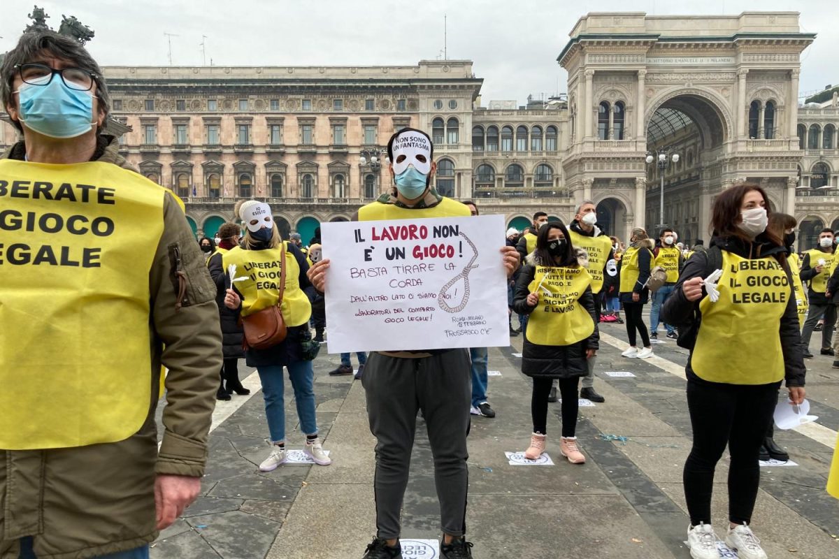 Alcuni non indossano una maschera soltanto, ma due. Quella sopra la bocca e il naso, per proteggersi dal coronavirus. E un’altra, che copre gli occhi e la fronte. È tutta bianca, ha varie scritte nere in caratteri maiuscoli: «Io esisto»; «Esisto e ho famiglia»; «Non fateci scomparire». O la più ricorrente: «Io non sono un fantasma». La pettorina, invece, è gialla e contrasta con forza con il cielo plumbeo di Milano, sembra quasi fare a schiaffi con una giornata così nebbiosa e dimessa. «Gioco legale = Gioco sicuro»; «Liberate il gioco legale» sono gli slogan stampati più ricorrenti sulla divisa dei manifestanti.