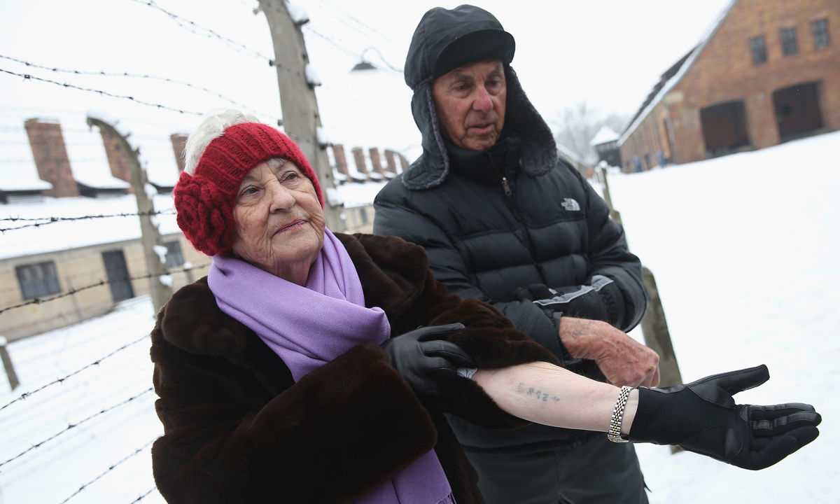 Oswiecim, Polonia, 26 gennaio 2015. Rose Schindler, 85 anni, sopravvissuta al campo di concentramento di Auschwitz-Birkenau, e il marito Max, sopravvissuto al vicino campo di Plaszow, mostrano i numeri di matricola che i nazisti tatuarono sulle loro braccia. Rose giunse ad Auschwitz nel 1944, 14enne, condotta qui dall’allora Cecoslovacchia. Vi trascorse 3 mesi, durante cui la madre, il padre e le sorelle vennero assassinate. Lei e Max, un ebreo tedesco di Cottbus, si incontrarono poco dopo la guerra, entrambi rifugiati in Gran Bretagna, e lì si sposarono.