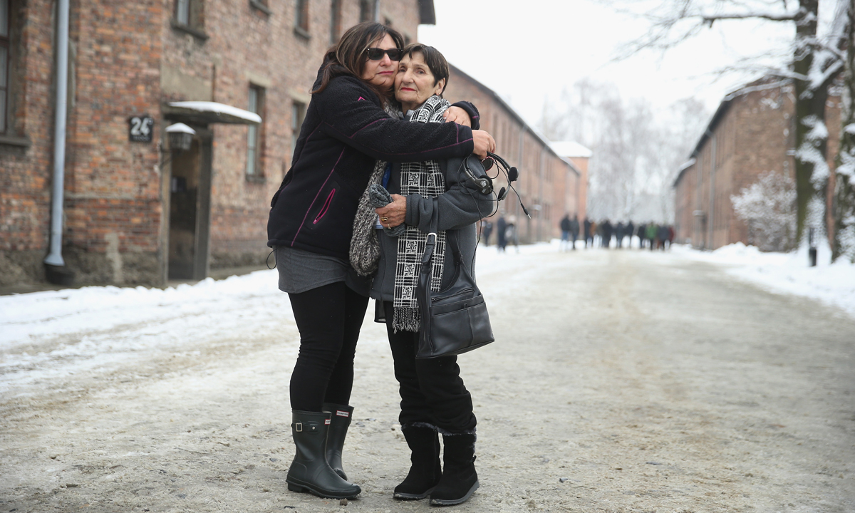 Oswiecim, Polonia, 26 gennaio 2015. Doris Krinsky abbraccia la madre, Mascha Schainberg, che giunse prigioniera ad Auschwitz all’età di 14 anni. Oggi vive in Sudafrica.