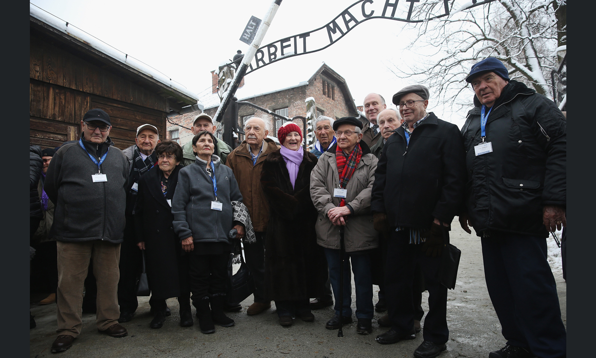 Oswiecim, Polonia, 26 gennaio 2015. Un gruppo di sopravvissuti posano per una foto sotto la tristemente celebre scritta “Arbeit Macht Frei” (Il lavoro rende liberi), all’ingresso del campo di concentramento di Auschwitz I.
