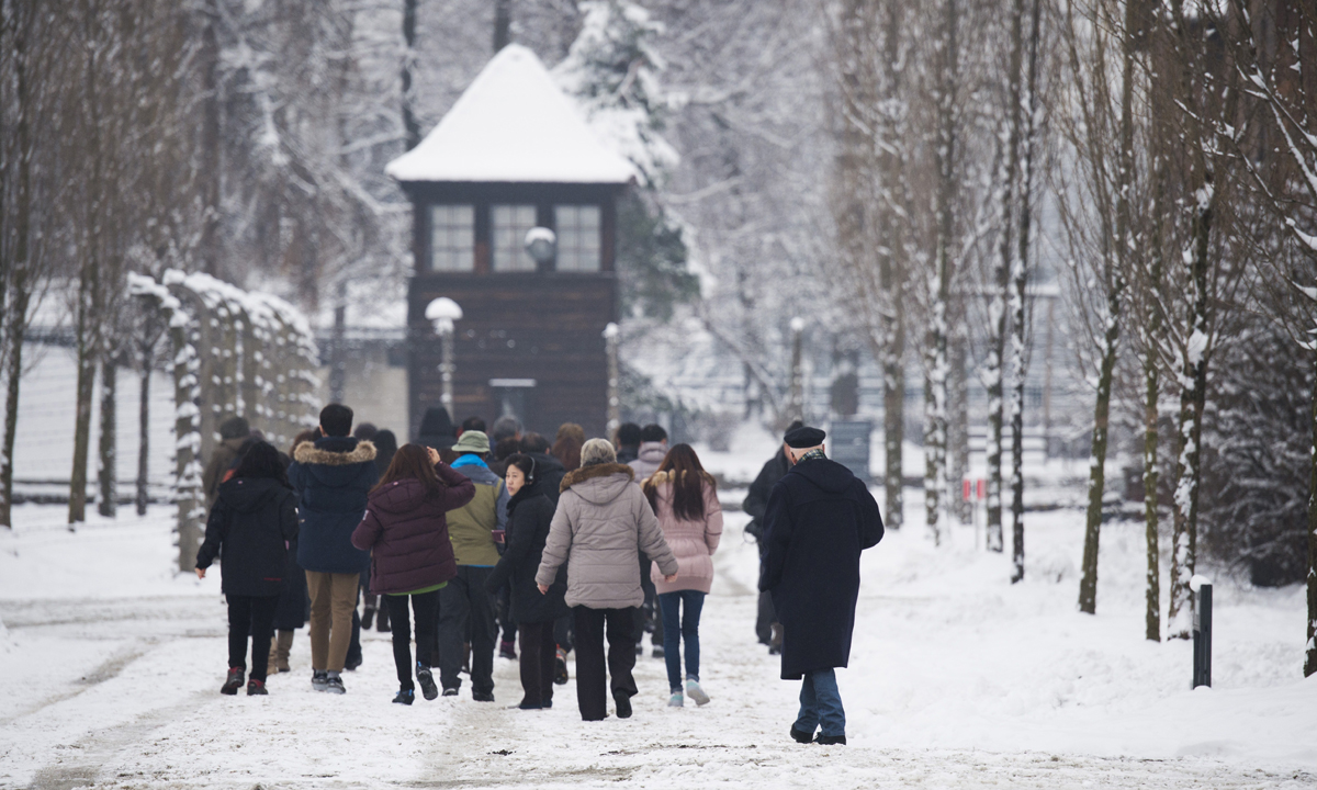 Oswiecim, Polonia, 26 gennaio 2015. Un gruppo di sopravvissuti attraversano il campo di concentramento di Auschwitz coperto di neve.