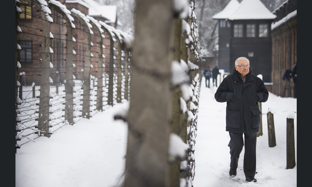 Oswiecim, Polonia, 26 gennaio 2015. Il sopravvissuto Jack Rosenthal, oggi statunitense, cammina attraverso il campo di concentramento di Auschwitz coperto di neve.