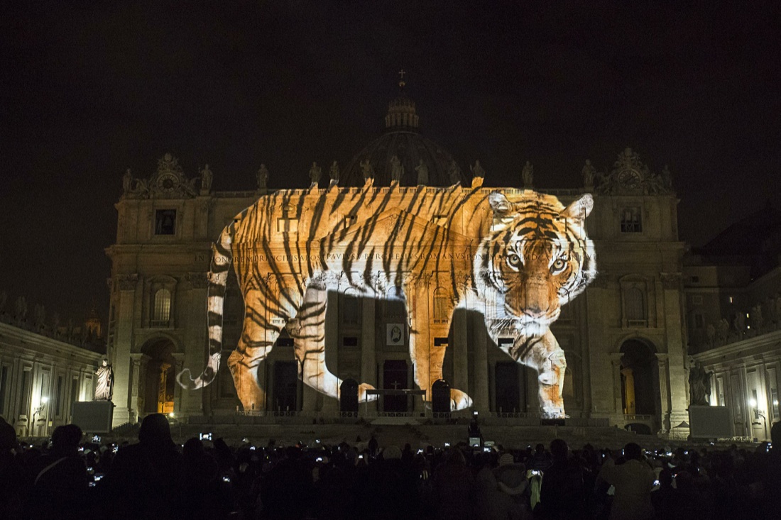 Un momento dell’evento (in occasione dell’apertura del Giubileo Straordinario della Misericordia) ”Fiat Lux: illuminare la nostra casa comune”: proiezione sulla facciata della Basilica di San Pietro con immagini della natura di tutto il mondo, Roma, 8 Dicembre 2015.
