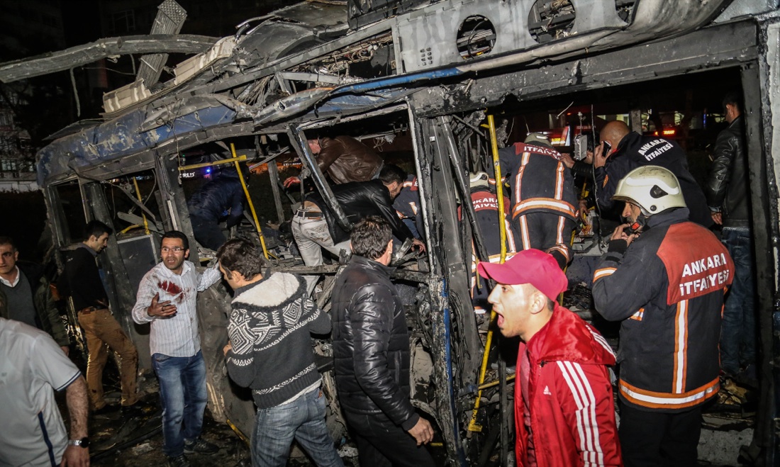 I soccorsi sull’autobus esploso nel centro di Ankara in Turchia a causa di un’autobomba – 13 marzo 2016