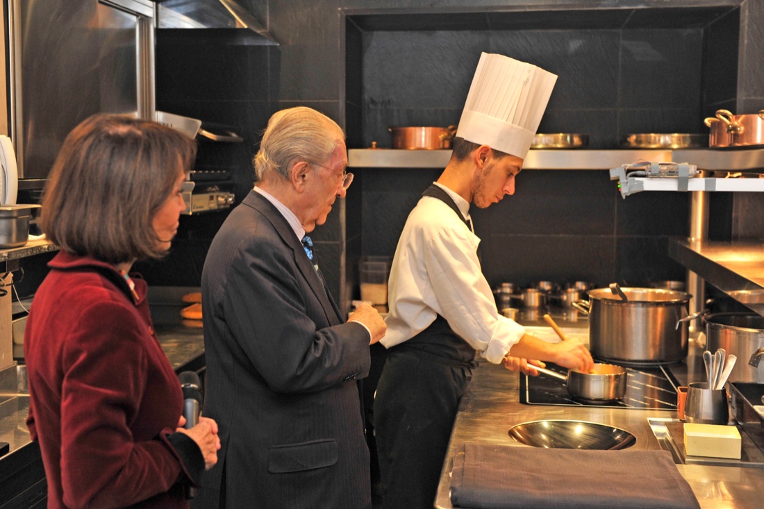 Il giovane chef Alessandro Laganà segue le indicazioni di Gualtiero Marchesi per la preparazione del risotto con l’oro