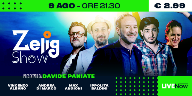 Zelig continua a stupire il suo pubblico. Una “banda” di comici in movimento rappresentano lo spirito e l’energia che Zelig trasmette da quasi 30 anni alla città di Milano e in tv. Zelig Show Summer Edition sarà disponibile a pagamento anche in diretta streaming su LiveNow. Lo spettacolo è parte di Estate Sforzesca 2020, la rassegna che anima ormai da otto anni le serate estive milanesi. Il programma della manifestazione, con i suoi 80 spettacoli, promosso e coordinato dal Comune di Milano è il cuore di “Aria di Cultura”, il palinsesto di iniziative che accompagna la ripresa dello spettacolo dal vivo e delle attività culturali in città dopo la chiusura dei teatri e delle aree di spettacolo a causa della pandemia.