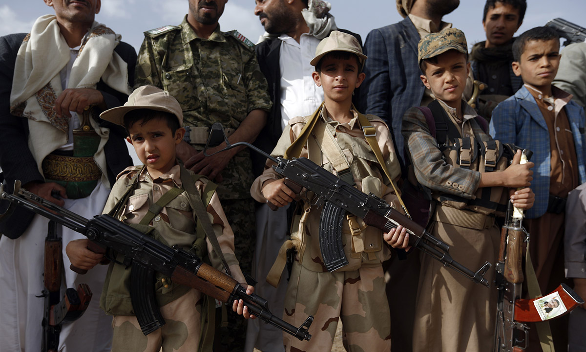 18 giugno 2017. Bambini armati prendono parte a un evento organizzato dai ribelli sciiti Huthi per mobilitare altri combattenti contro le forze filo-governative, a Sana’a, in Yemen.