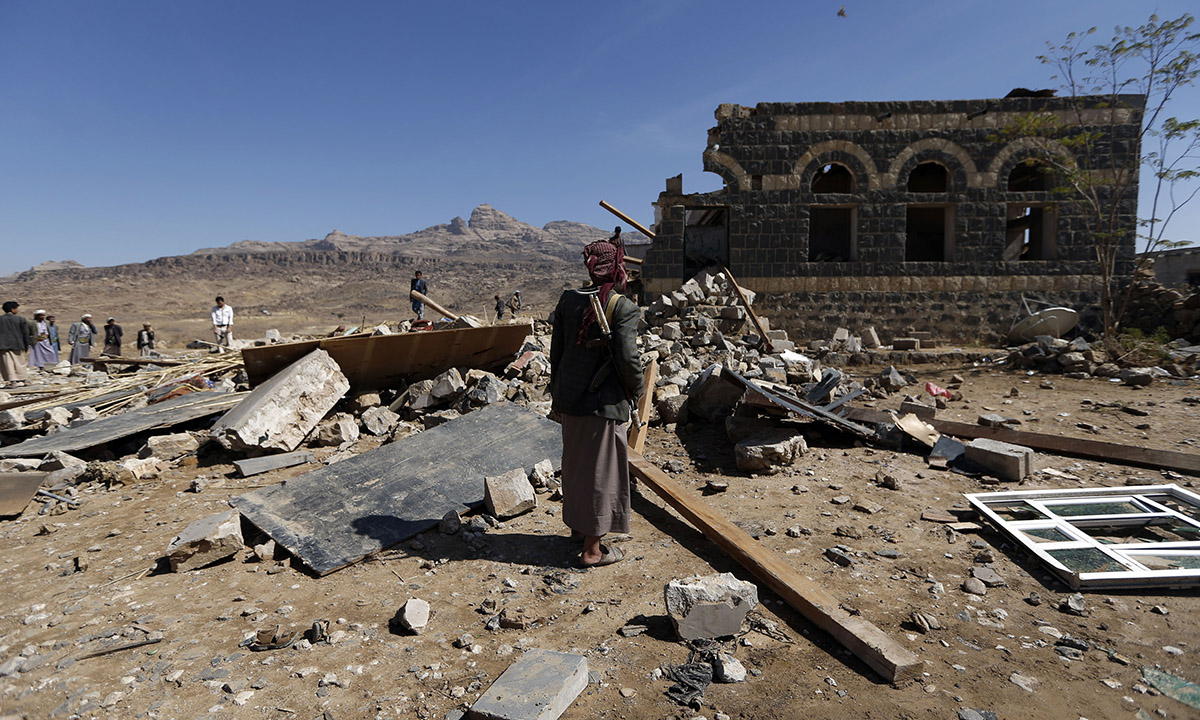 16 febbraio 2017. Degli uomini perlustrano un sito colpito da un raid aereo durante un funerale nel distretto di Arhab, 40 km a nord di Sana’a in Yemen.