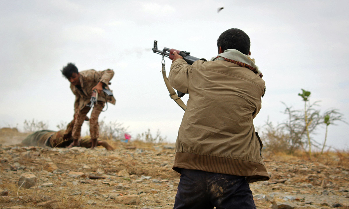 9 giugno 2017. Un soldato del Comitato di resistenza popolare, impegnato a fianco delle forze leali al presidente Abedrabbo Mansour Hadi, punta un’arma verso postazioni nemiche a Taez, la terza città dello Yemen.