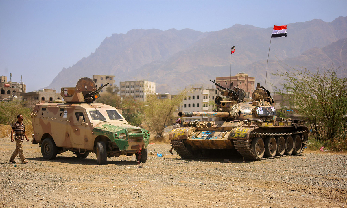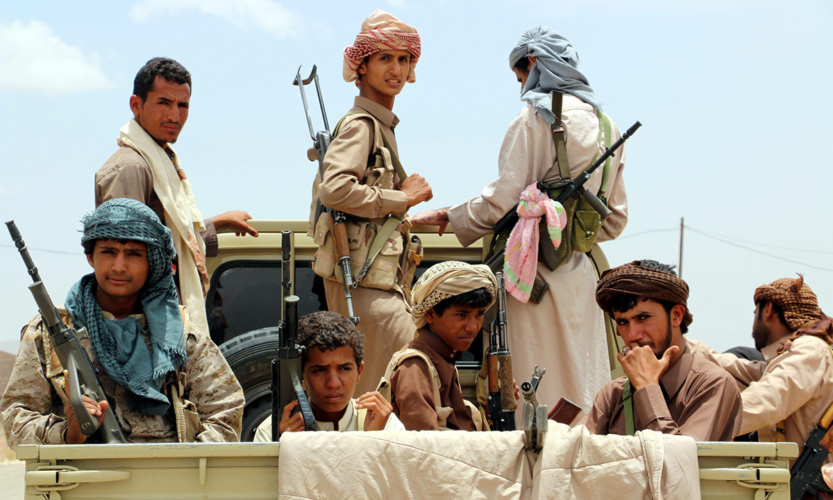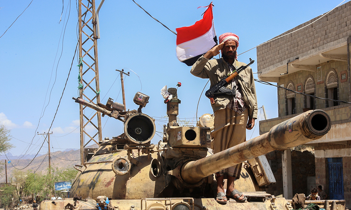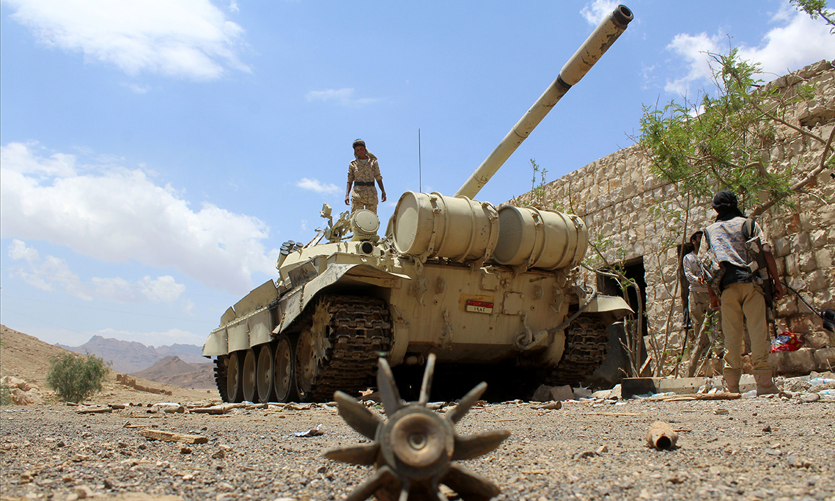 9 aprile 2016. Provincia di Marib, in Yemen, combattenti fedeli al presidente esiliato, sostenuti dalla coalizione a guida saudita, si muovono a bordo di un veicolo durante un’offensiva contro alcune postazioni dei ribelli Houthi, alla vigilia dell’entrata in vigore del cessate il fuoco.