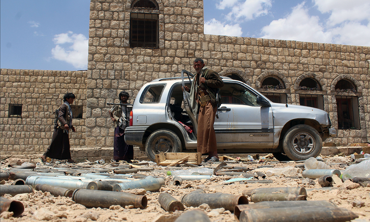 10 aprile 2016. Combattenti fedeli al presidente in esilio Abedrabbo Mansour Hadi accanto a delle granate esplose nell’area si Sirwah, nella provincia di Marib, dove continuano gli scontri con i ribelli Huthi.