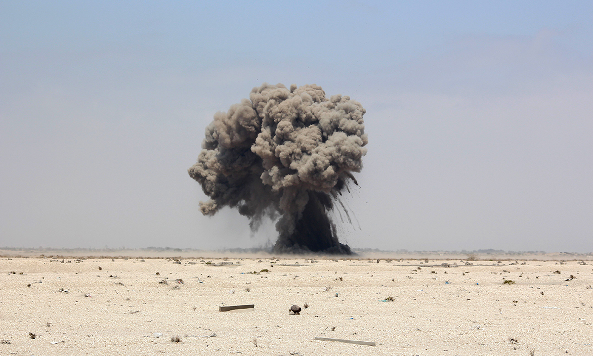 Deserto di al-Alam, Yemen, 10 marzo 2016. Una colonna di fumo sprigionata dall’esplosione controllata di ordigni rimasti inesplosi confiscati ai ribelli sciiti Huthi e ai combattenti jihadisti, a est della città portuale.