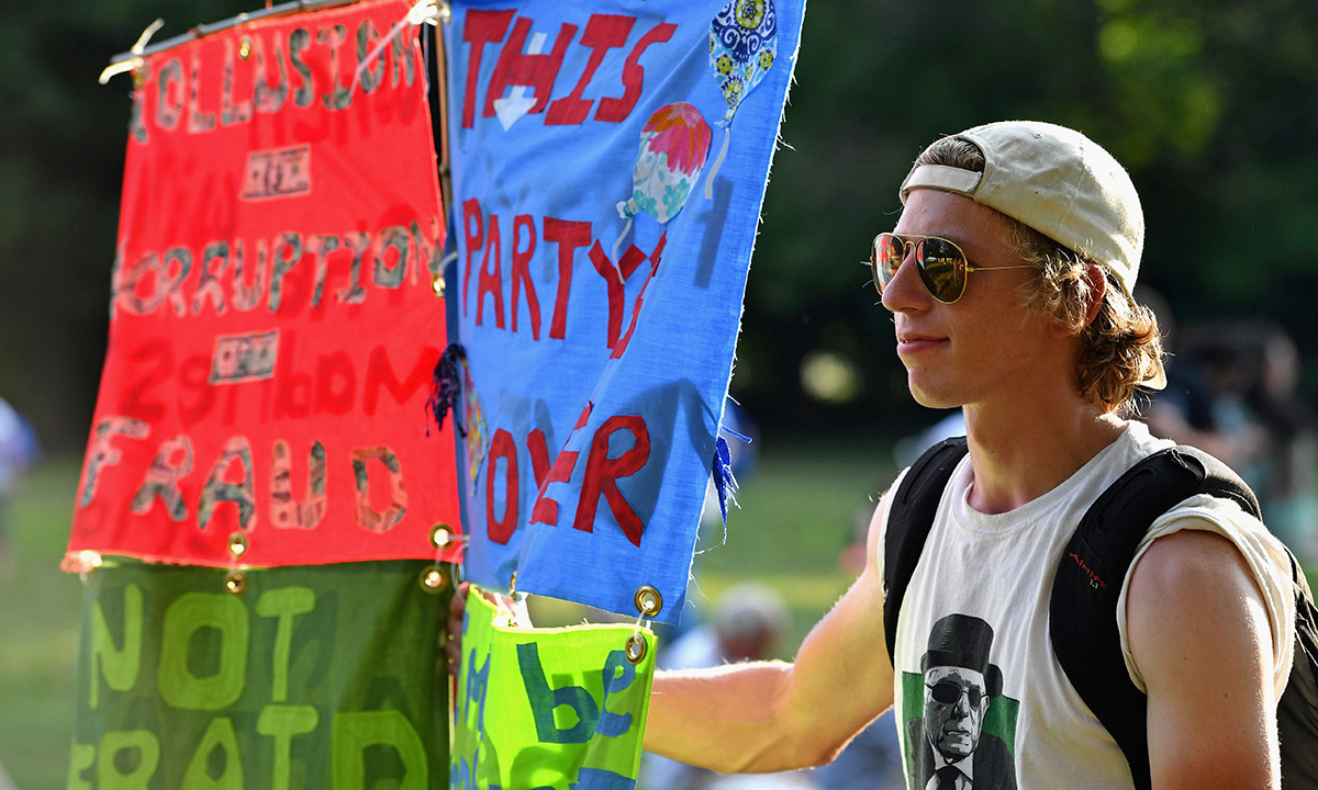 24 luglio 2016. Un sostenitore di Bernie Sanders mostra uno striscione con slogan ambientalisti a Philadelphia, in Pennsylvania, dov’è in corso la Convention dei Democratici.