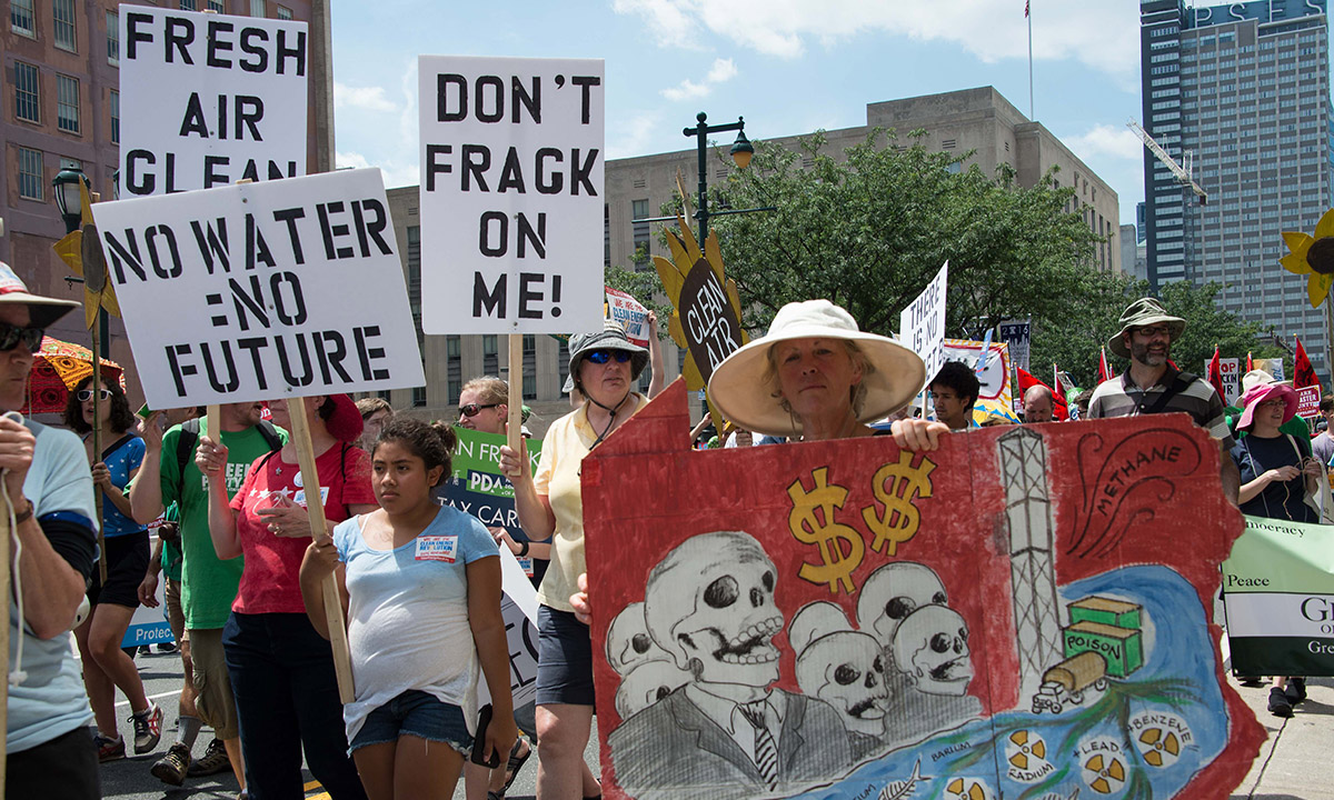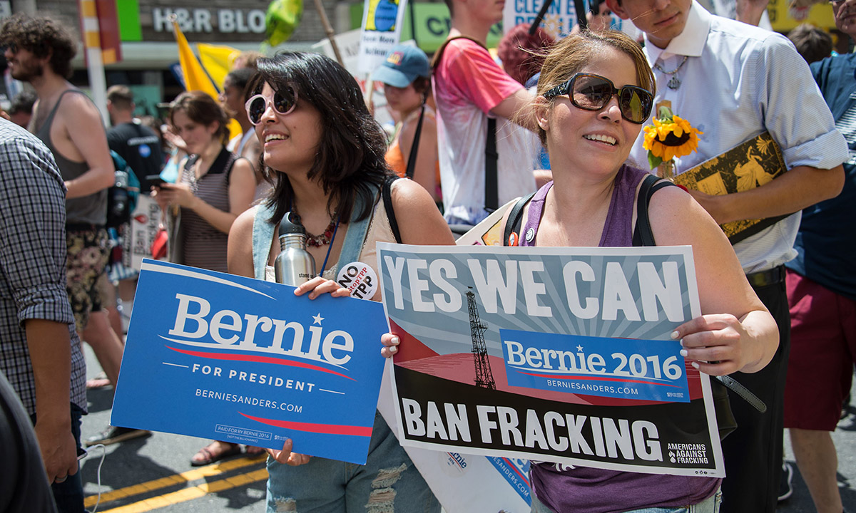 24 luglio 2016. Sostenitori di Bernie Sanders partecipano a una manifestazione per l’energia pulita, contro il fracking e contro la candidatura di Hillary Clinton a Philadelphia, in Pennsylvania, dov’è in corso la Convention dei Democratici.