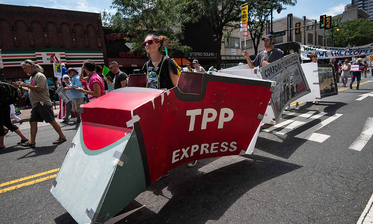 24 luglio 2016. Una sostenitrice di Bernie Sanders partecipa con un finto veicolo che rappresenta il TPP (Partenariato Trans-Pacifico (TPP) a una manifestazione contro la candidatura di Hillary Clinton a Philadelphia, in Pennsylvania, dov’è in corso la Convention dei Democratici.