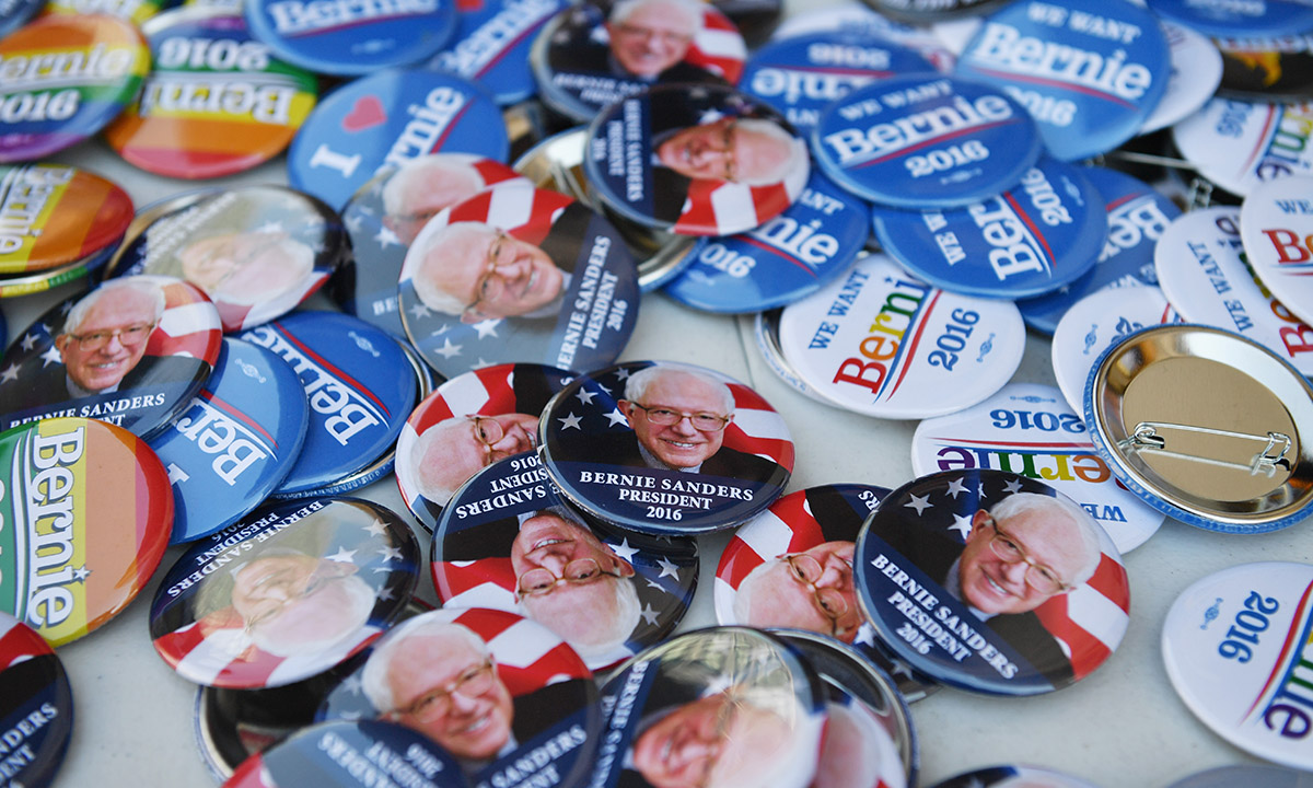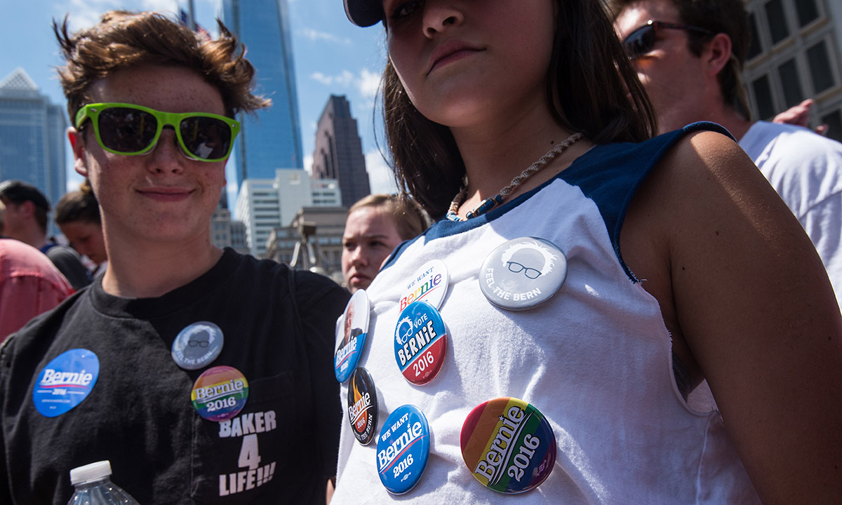 24 luglio 2016. Spillette della campagna elettorale di Bernie Sanders a Philadelphia, in Pennsylvania, dov’è in corso la Convention dei Democratici.