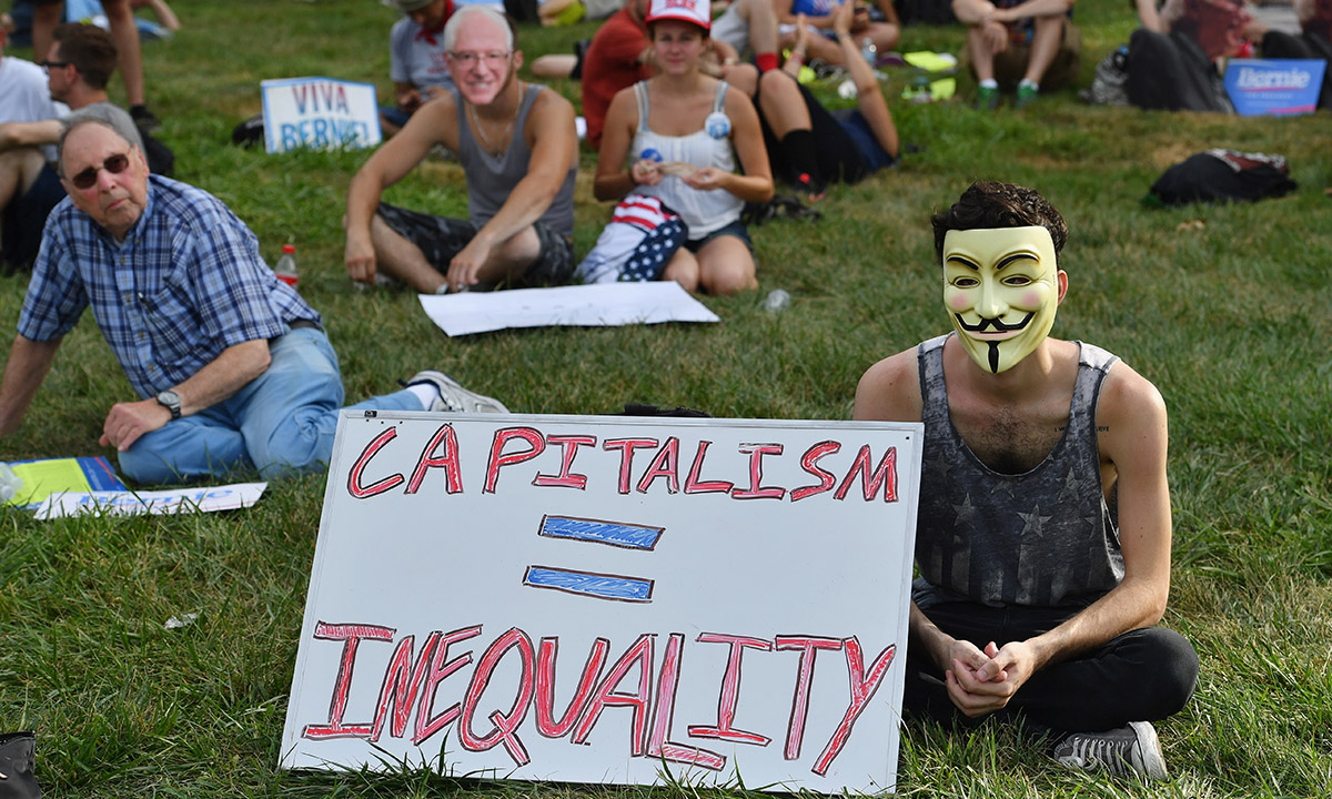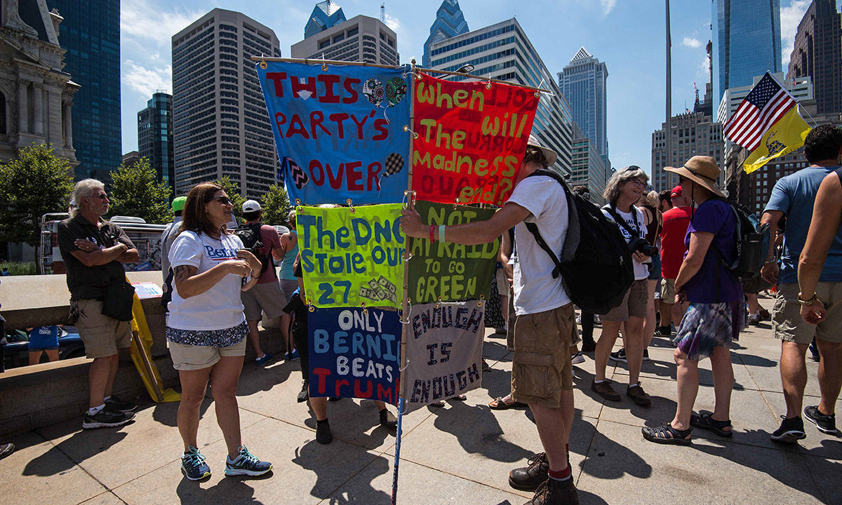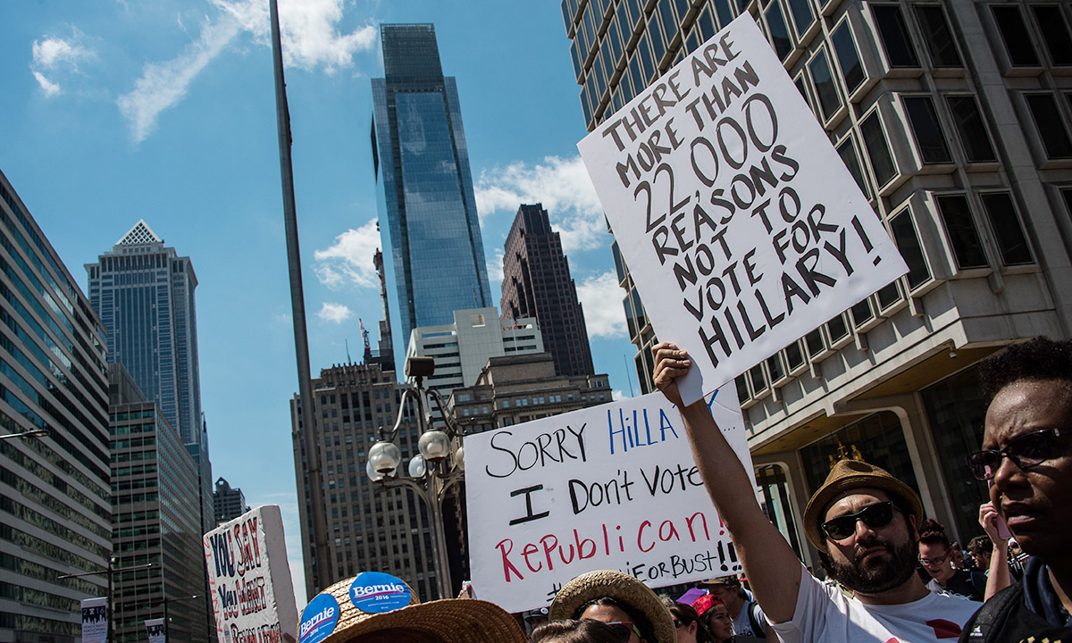 24 luglio 2016. Sostenitori di Bernie Sanders partecipano alla manifestazione contro la candidatura di Hillary Clinton a Philadelphia, in Pennsylvania, dov’è in corso la Convention dei Democratici.