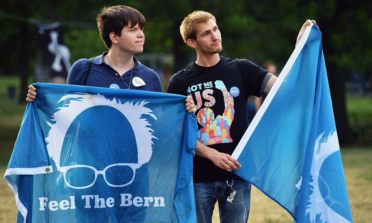 24 luglio 2016. Sostenitori di Bernie Sanders prima della manifestazione contro la candidatura di Hillary Clinton a Philadelphia, in Pennsylvania, dov’è in corso la Convention dei Democratici.