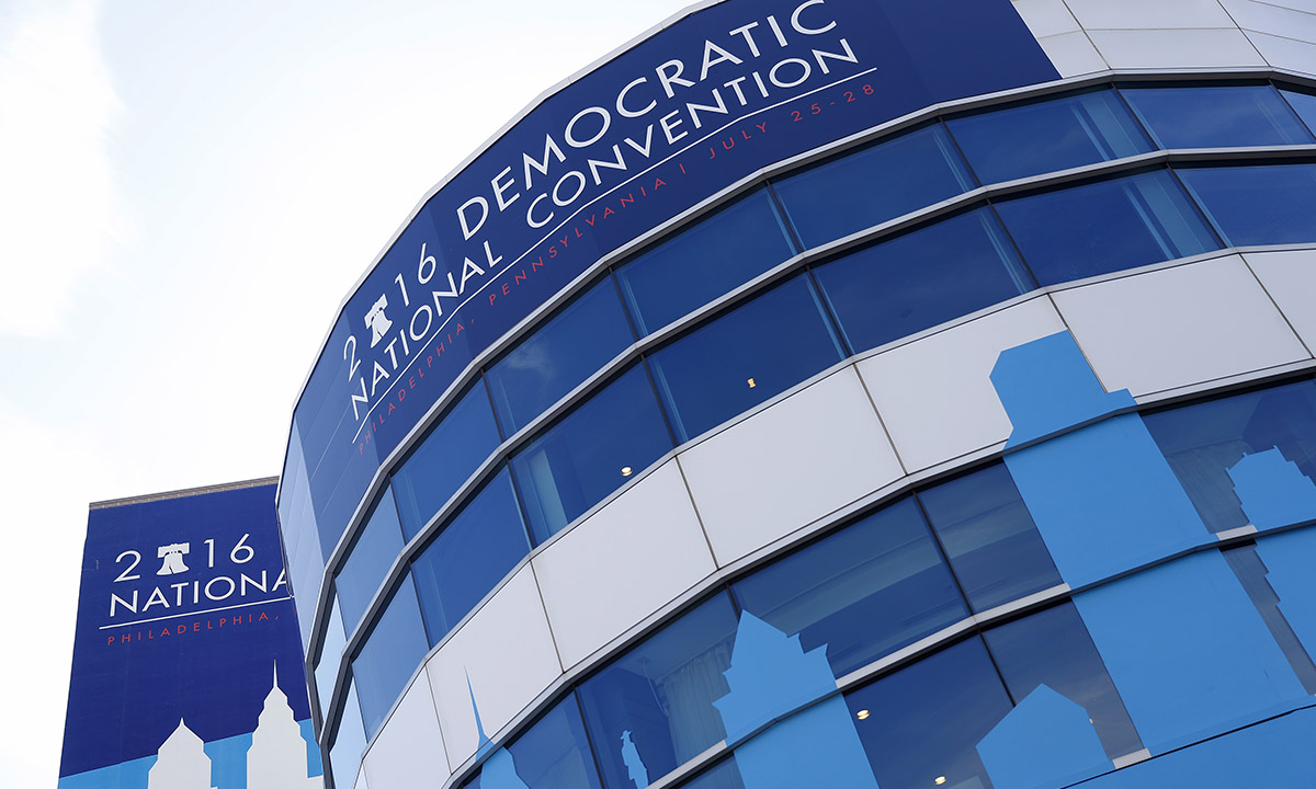 24 luglio 2016. L’esterno del Wells Fargo Center di Philadelphia, in Pennsylvania, sede della Convention nazionale dei Democratici.