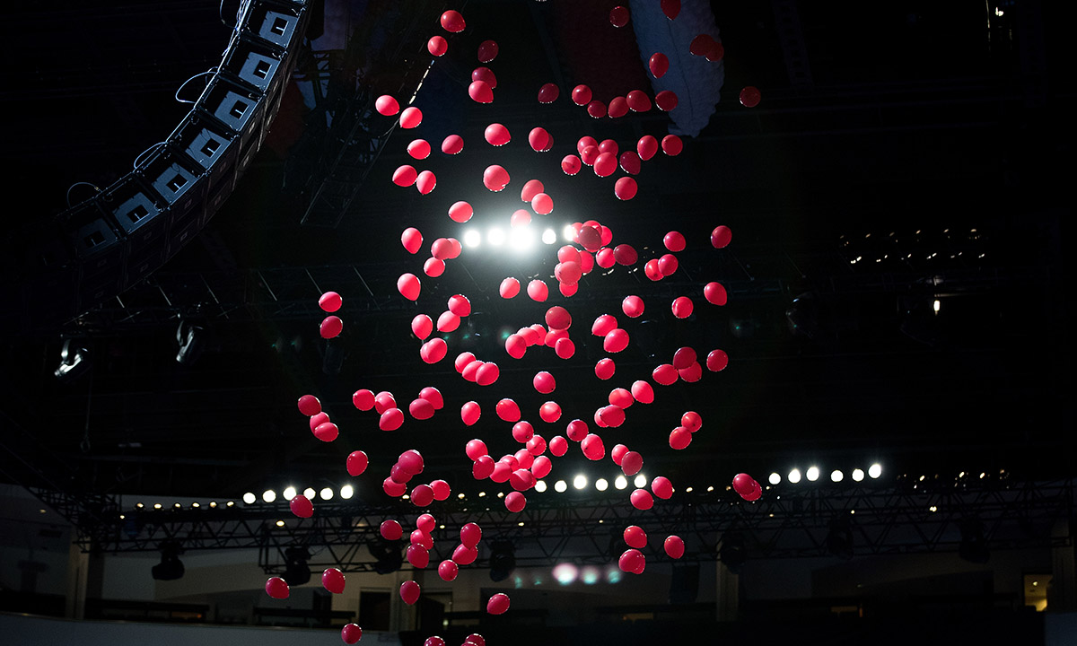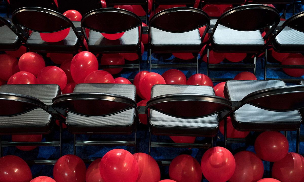 24 luglio 2016. Palloncini rossi del “gran finale” caduti per errore alla grande sala del Wells Fargo Center di Philadelphia, in Pennsylvania, sede della Convention nazionale dei Democratici.