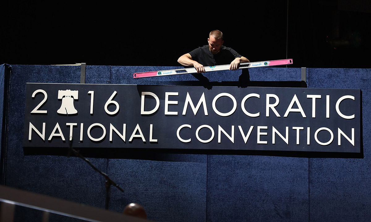 24 luglio 2016. Un operaio mette a punto gli ultimi dettagli presso il Wells Fargo Center di Philadelphia, in Pennsylvania, sede della Convention nazionale dei Democratici.