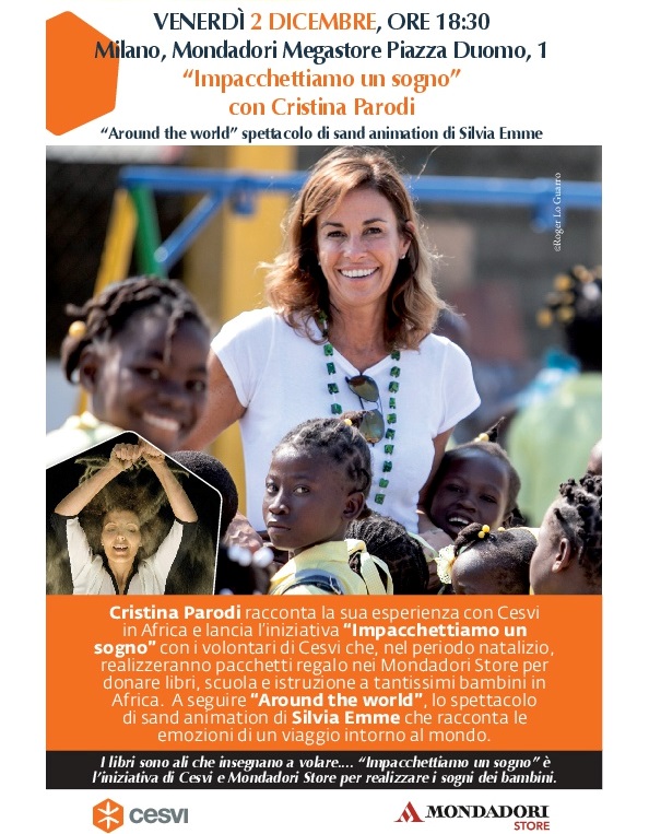 Venerdì 2 dicembre alle ore 19.00, presso il Mondadori Megastore in Piazza Duomo a Milano, Cristina Parodi darà il via all’iniziativa di Cesvi,  in collaborazione con Mondadori Store, “Impacchettiamo un sogno”.  Durante tutto il periodo natalizio, i volontari Cesvi saranno presenti in più di 60 Mondadori Bookstore e Megastore delle principali città italiane per realizzare pacchetti regalo. Un’iniziativa che prosegue per il secondo anno, dopo l’ottima accoglienza ricevuta lo scorso Natale.