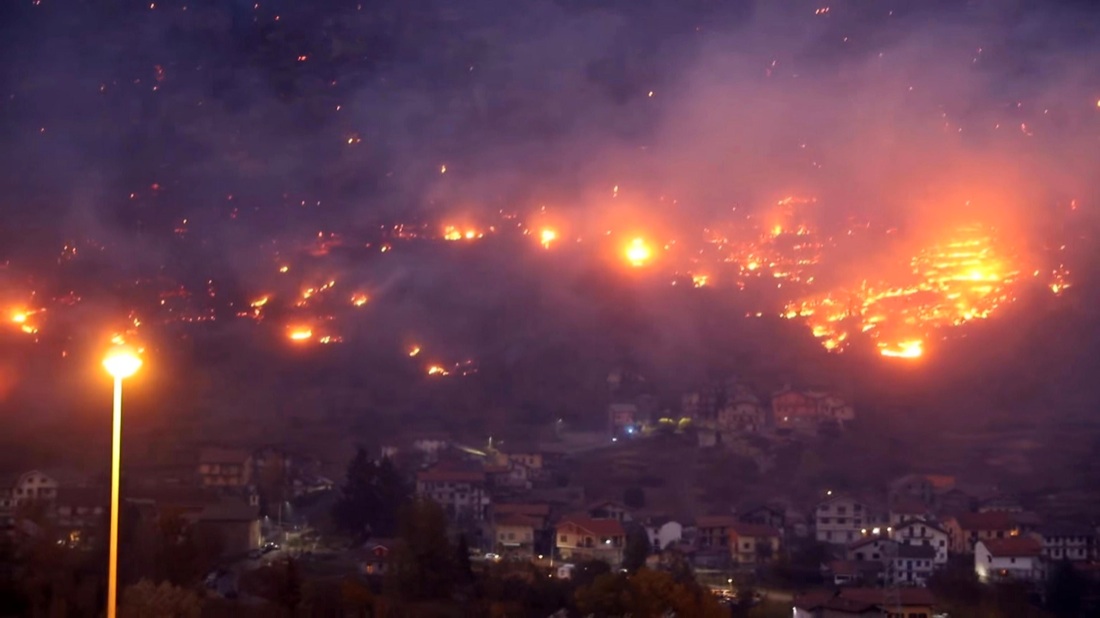 Un momento dell’incendio sulle montagne di Mompantero a Susa, Torino, 27 ottobre 2017