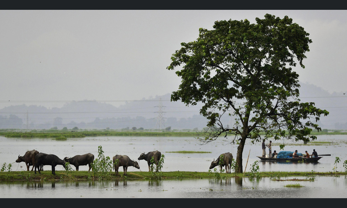 Distretto di Morigaon, Assam, India, 22 agosto 2015. Un uomo porta in salvo la famiglia con un’imbarcazione, su cui trasporta anche alcuni oggetti recuperati dalla loro casa sommersa dall’acqua.