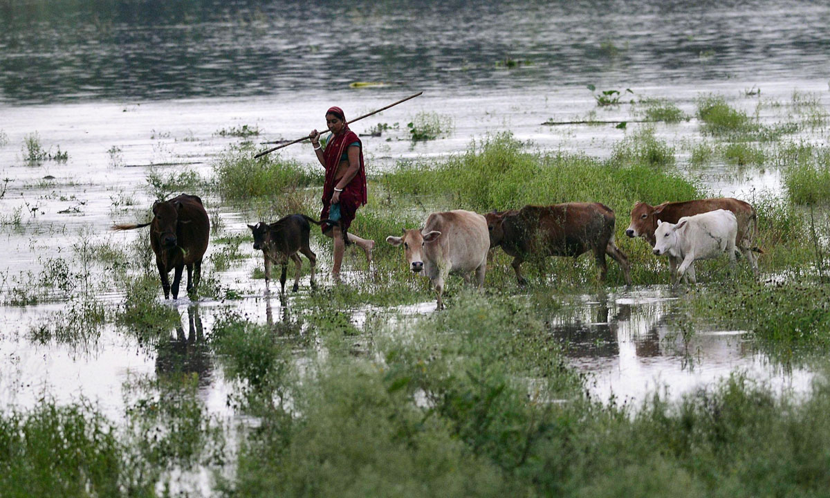 Distretto di Morigaon, Assam, India, 21 agosto 2015. Una donna conduce le sue mucche in salvo attraverso le acque alluvionali.