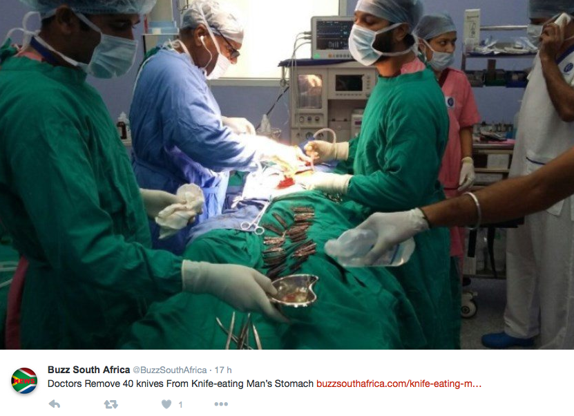 Una equipe di cinque chirurghi indiani hanno operato un agente di polizia che aveva manifestato forti dolori al ventre, estraendo dal suo stomaco 40 coltelli, che aveva ingerito di sua volontà, molti a serramanico chiusi, ma altri aperti e con la lama esposta.
