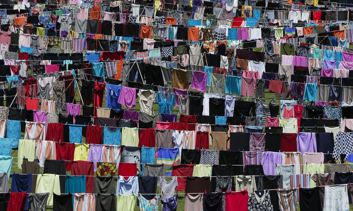 Sul campo da gioco dello stadio, l’artista ha appeso con delle mollette, lungo 45 fili per stendere i panni, circa 5.000 abiti femminili di ogni colore giunti da varie parti del mondo e donati anche da personaggi celebri come Cherie Blair o Diane Von Fürstenberg. I panni puliti simboleggiano l’innocenza delle donne abusate, mentre lo stadio vuole rappresentate il mondo dei maschi. L’installazione vuole essere un invito alle vittime a “lavare i panni sporchi in pubblico“, a parlare cioè delle violenze subite e a denunciarle, superando il muro di vergogna e silenzio che ancora oggi frena la maggior parte delle sopravvissute.