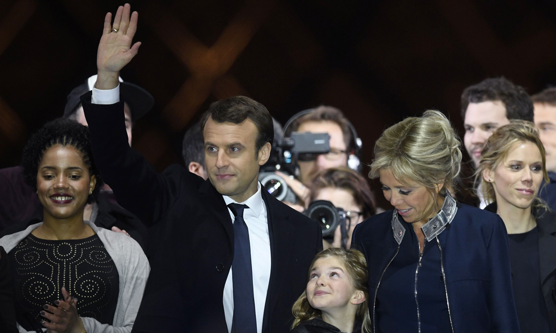 Parigi, 7 maggio 2017 – Il presidente eletto Emmanuel Macron, sua moglie Brigitte Trogneux, la figlia Tiphaine Auziere e il marito Antoine Choteau che salutano i sostenitori davanti alla piramide al Museo del Louvre a Parigi il 7 maggio 2017, giorno delle elezioni presidenziali francesi